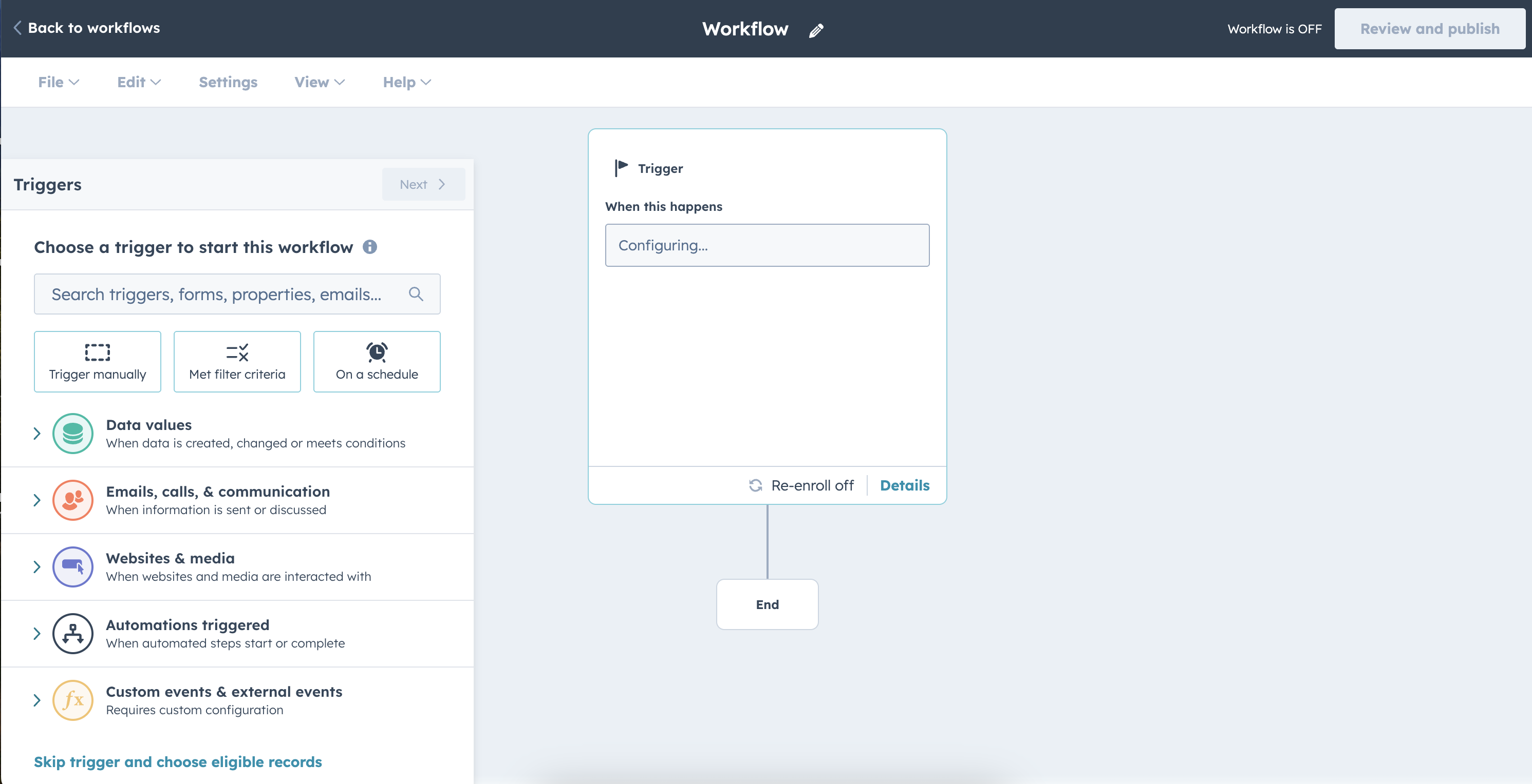 If you want to control every aspect of your workflow from start to finish, create your own workflow Mona Lisa by hand. Choosing this option brings you to a blank builder from which you can set triggers, add variables, and adjust logic. A few of my examples below start from this screen—but don’t worry, I show my work in those cases.