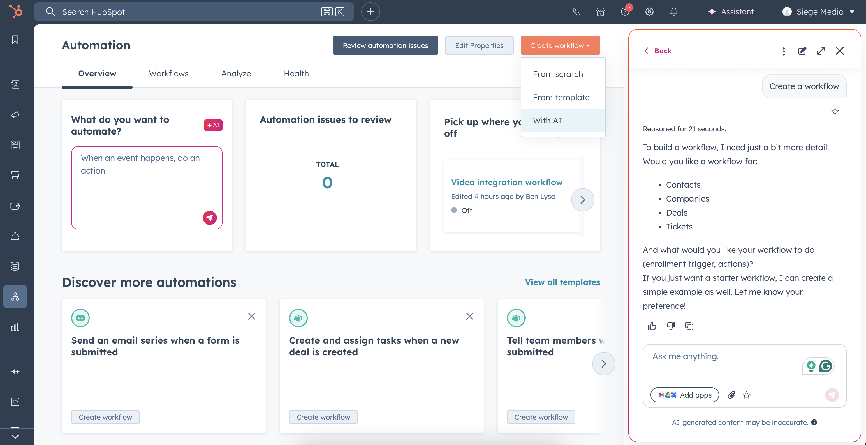 If you’d rather limit your effort expenditure—or if you have just a vague idea for a workflow but need a little help—build a workflow with the help of HubSpot’s AI chatbot. This little automated assistant pops up in the corner of your screen, where you can tell it in plain English what you’d like to build. It may retort with some follow-up questions like “You need to link an account” or “Sorry, I can’t automate your entire job,” but it’s a very useful helper for building something when your ambitions are a bit ahead of your technical knowledge.