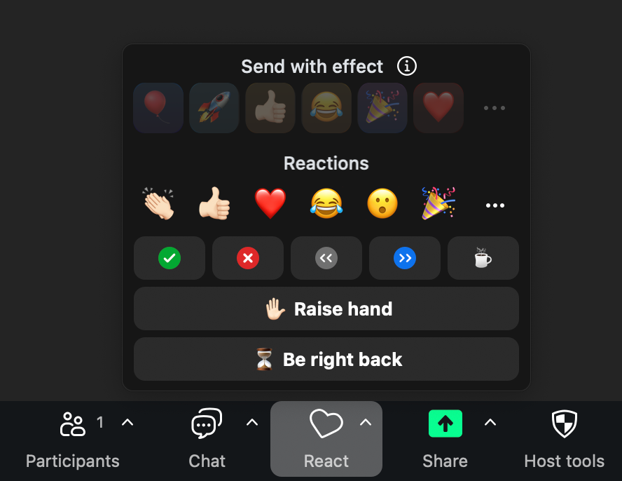 While you’re there, you can choose other meeting reactions—for example, thumbs up, heart, and clapping hands—or non-verbal feedback—for example, yes, no, slow down, and speed up.