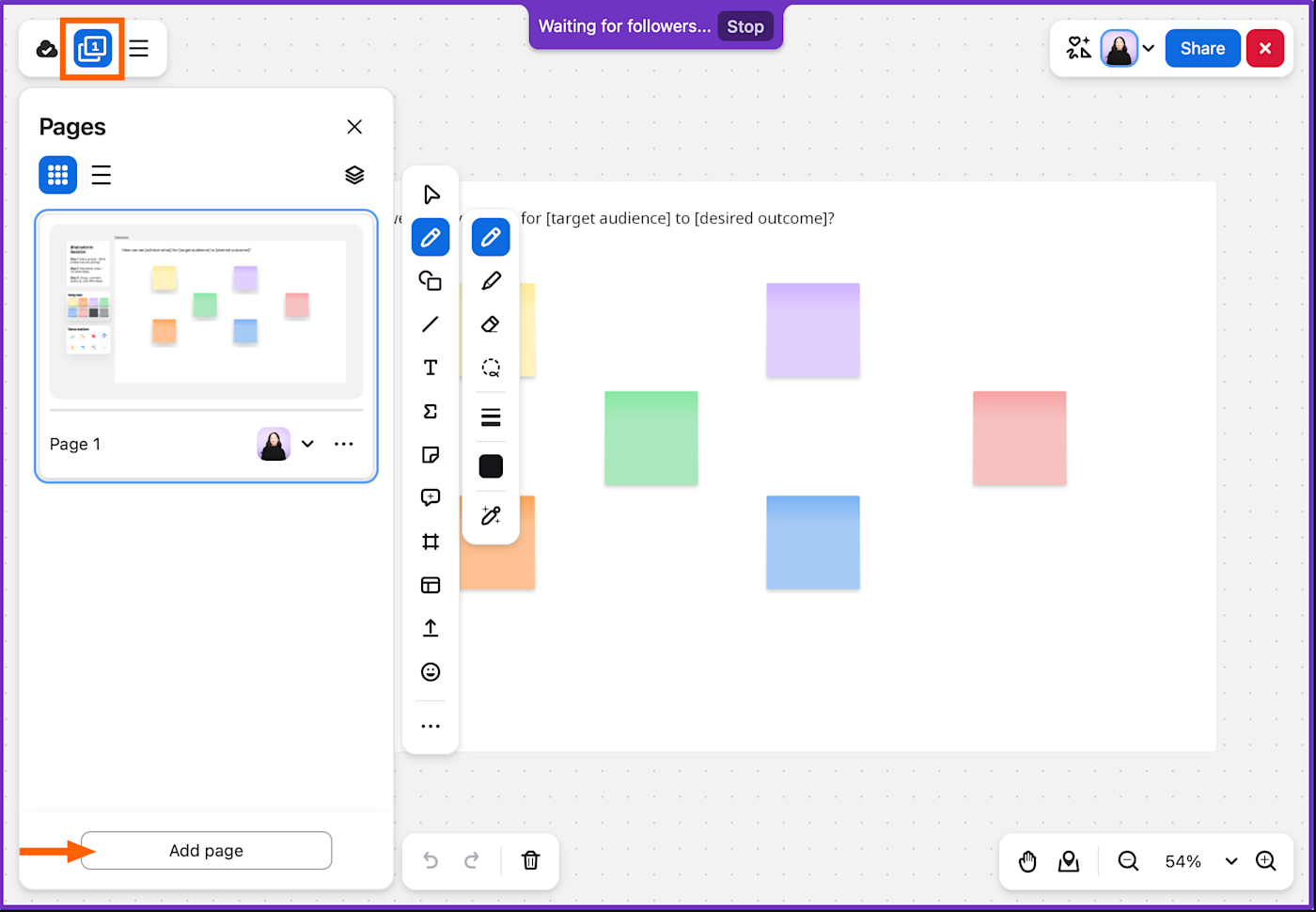 To add more pages to your whiteboard, click the Page icon in the top-left corner, and then click Add page. Note: You can only add blank whiteboard pages—not templated ones.