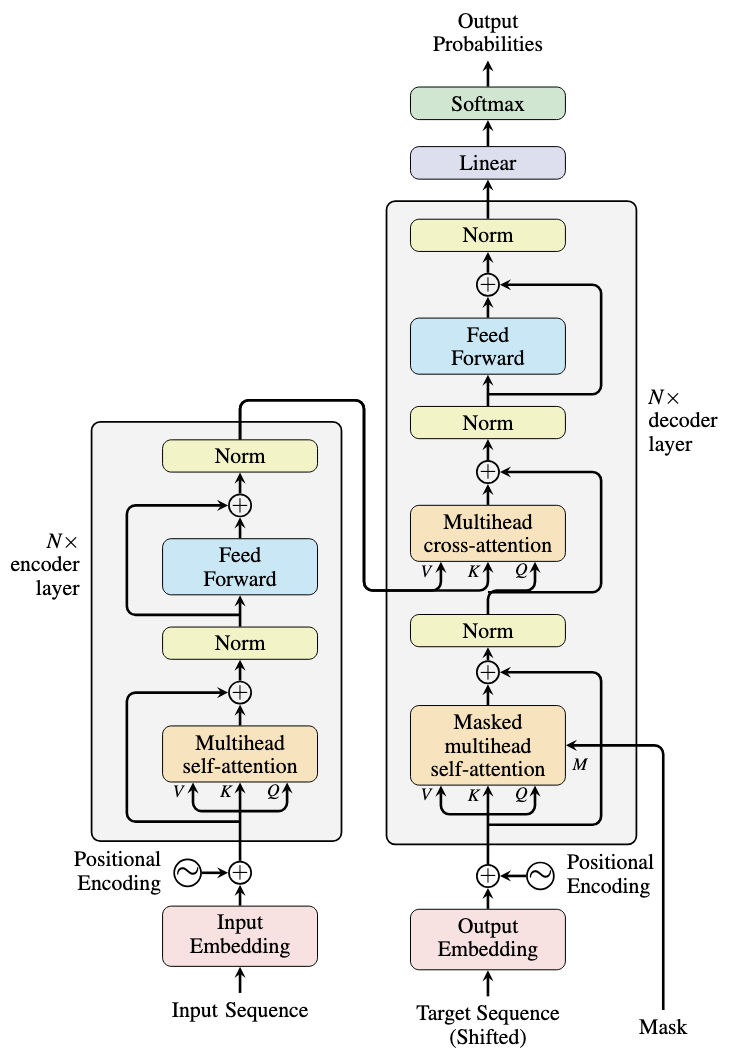 The original transformer architecture, introduced in “Attention is All You Need,” combines an encoder and decoder specifically designed for sequence-to-sequence (seq2seq) tasks like machine translation. The architecture is illustrated below.