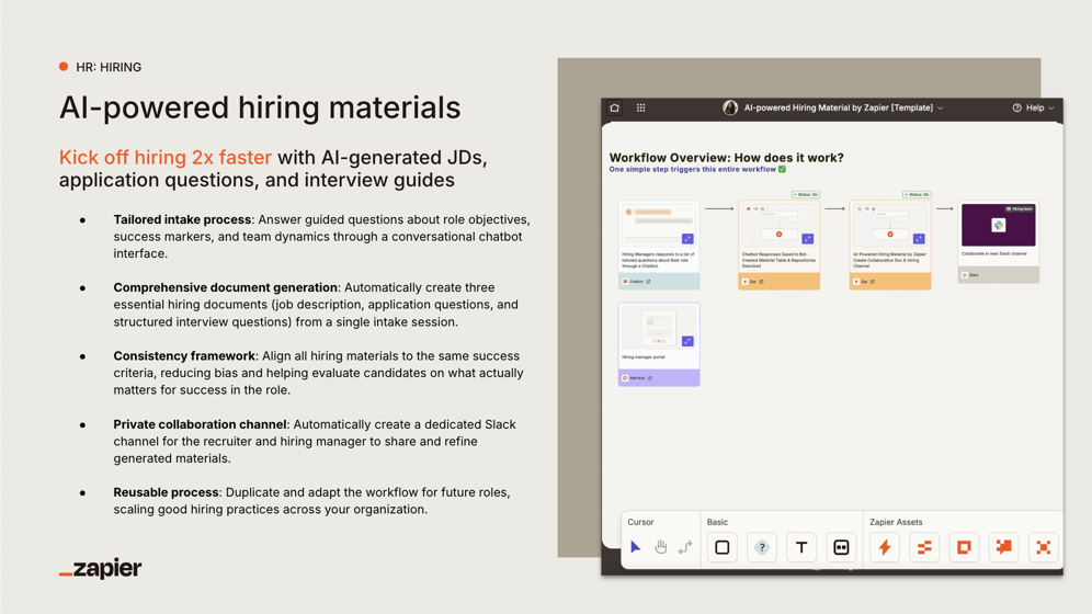 Tracy shared how Zapier took the same approach. Their hiring plan workflow uses Slack, Google Sheets, and Zapier Chatbots to help hiring managers spin up job descriptions and interview rubrics in minutes, pulling from past roles and organizational standards.